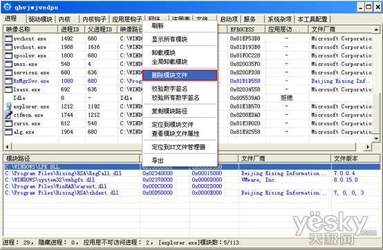 这是由于病毒文件已经被激活调用,普通方式无法直接删除。这时通过XueTr可以看到删除报错的lpk.dll正挂在系统正在运行的进程下,逐一找到正加载的lpk.dll,右键选中将其删除。