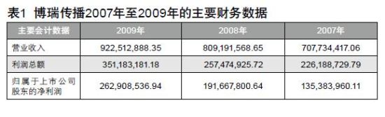 博瑞传播的盈利情况很好。如表1所示,2009年,公司实现营业收入9.2亿元,净利润2.6亿元,连续三年稳定增长。