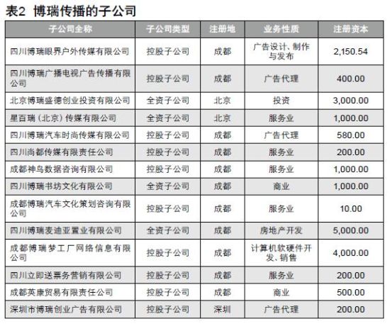 在坚持发展传统的广告、印刷等业务的同时,博瑞传播开始进军新的业务增长领域。2009年6月,博瑞传播斥资4.47亿元收购本土网游企业——成都梦工厂网络信息有限公司100%股权,试图借此实现从“报业第一股”到“网游第一股”的突破,实现从平面媒体经营业务向综合性多媒体经营业务的跨越。2009年10月,博瑞传播设立了创业投资平台——北京博瑞盛德创业投资有限公司,注册资本3000万元,主要从事创业投资业务,主要投资方向是文化传媒项目和Pre-IPO项目。博瑞传播的子公司主要如表2所示。