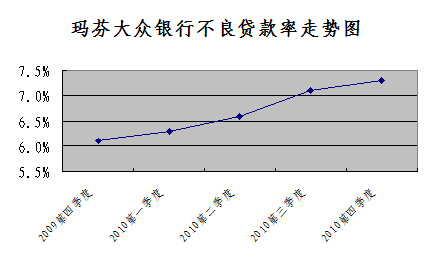 2010年玛芬大众银行集团总收入9.10亿欧元,同比增长5%,这主要得益于净利润收入12%的强劲增长。由于固定收益市场的不景气,导致该集团相关金融服务的收入有所下滑,致使其全年10.12亿欧元的营业收入较前一年下降了6%。2010年玛芬大众银行存款总额255亿欧元,同比增长7%;放贷总款274亿欧元,年增长率6%,其中向塞浦路斯本国市场投放的贷款增长了12%,致使该集团在本国贷款市场的份额从16.1%上升至17.0%。尽管个人贷款业务有所下降,但抵押贷款总额全年增长了11%,其中商业贷款上升7%,达到190亿欧元;航运贷款达到14亿欧元。