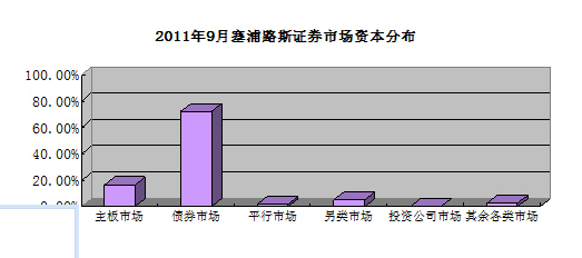 截至2011年9月,包含投资公司、债券和权证在内的证券市场总市值为109.7亿欧元,比上月的112.8亿欧元下跌了2.76%。今年9月份成交额为2300万欧元,其中金融股对总成交额的贡献高达93.99%,这主要是由于投资者对塞浦路斯银行和玛芬大众银行的股票格外关注,其成交额分别占据总量的57.86%和28.78%。