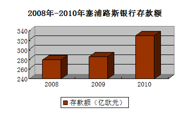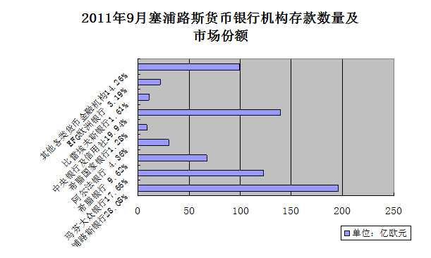 以储蓄业务为例, 2011年9月底塞浦路斯货币金融机构吸纳的698亿欧元储蓄存款中,塞浦路斯银行的存款金额为195.97亿欧元,占全行业储蓄总额的28.08%;玛芬大众银行的存款金额为123.26亿欧元,占比17.66%;希腊银行的储蓄金额为67.13亿欧元,占比9.62%。上述三家银行占据了该国银行业一半以上的市场份额。