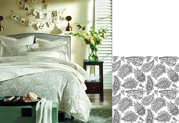 图3:Harbor House Preston印花系列 如图4的Stanfield全棉印花系列,设计灵感源于经久不衰的Paisley纹样,即“火腿花纹”,它诞生于古老的克什米尔地区披肩上的纹样,当地人视其为丰收、多产、幸福和生命的象征。这种被喻为最具有传统经典与现代时尚的两重特性的佩兹利图案,经过与不同时期的流行元素相结合,以及纹样大小疏密与色彩变化下,呈现出迷人的艺术魅力。