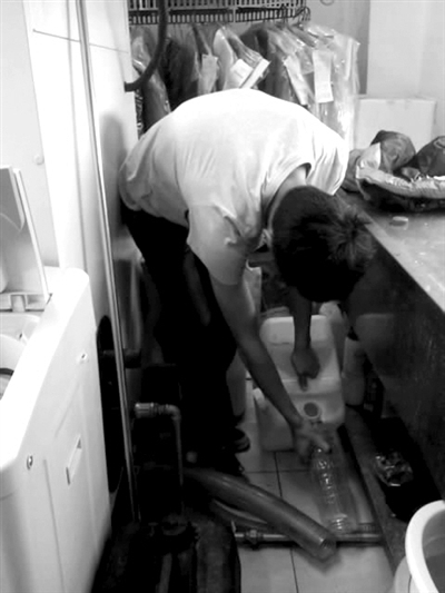 洗衣工从“三无”白色大桶内倒出洗衣液。