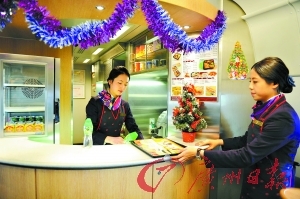 美丽的乘务人员及餐吧。记者黄澄锋摄