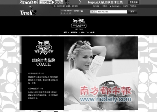 2011年12月12日,Coach与淘宝商城合作开设Coach淘宝商城官方旗舰店,初期试水期为一个月。网店销售一系列男女时尚配饰和礼品,涵盖手袋、配饰、外套、手表等多个产品。价格与实体店一致。不过,Coach不少商品将只会在Coach淘宝商城官方旗舰店独家销售。