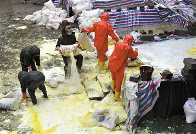 1月27日,在广西柳州市柳城县糯米滩水力发电厂,武警消防战士将袋装碱投入水池,准备引入江中稀释污染水体。