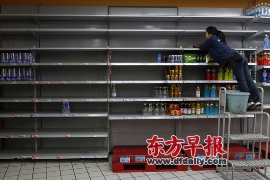 7日,南通市人民路大润发,一位超市工作人员正在擦洗空荡荡的饮用水货架。早报记者 王辰 图早报记者 鲁勋 龚菲