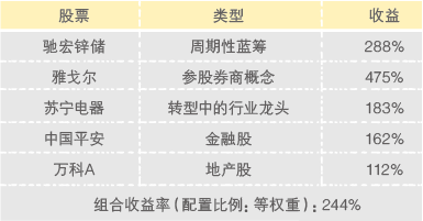 譬如,2006至2007年的大牛市演绎了一波普涨行情,周期性蓝筹股、特别是有色金属行业股、概念股及金融地产股上涨又最为迅猛。此时,一个重仓甚至满仓操作的完美投资者的股票组合可能是这样的: