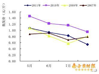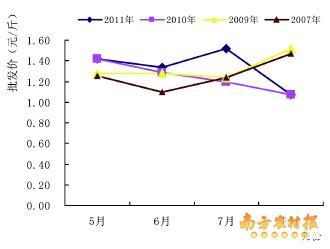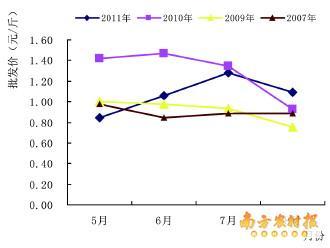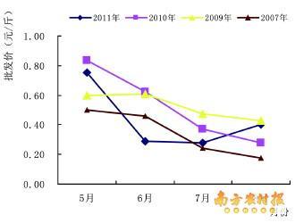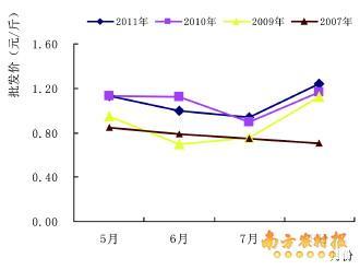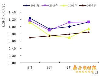 分析过去几年茄瓜价格走势可知,2010年价格远远高于其他年份,5-8月平均批发价为1.2元/斤,而2007、2009、2011年三个年份的批发价较一致,平均0.8元/斤左右。