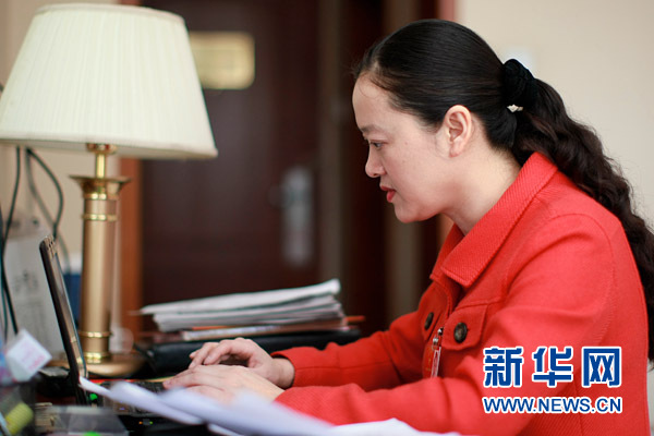 | 3月7日,全国人大代表何晓红在伏案写作宾馆房间修改发言稿。新华网记者 杨理光摄 |