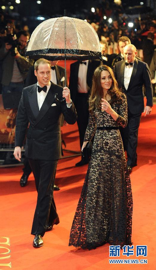 英国剑桥公爵夫人、威廉王子的妻子凯特王妃(右)在英国伦敦出席电影《战马》的首映礼时身着剪裁合身的收腰黑色蕾丝长礼服搭配黑色手包(1月8日摄)。 新华社/路透(程婷婷编辑)