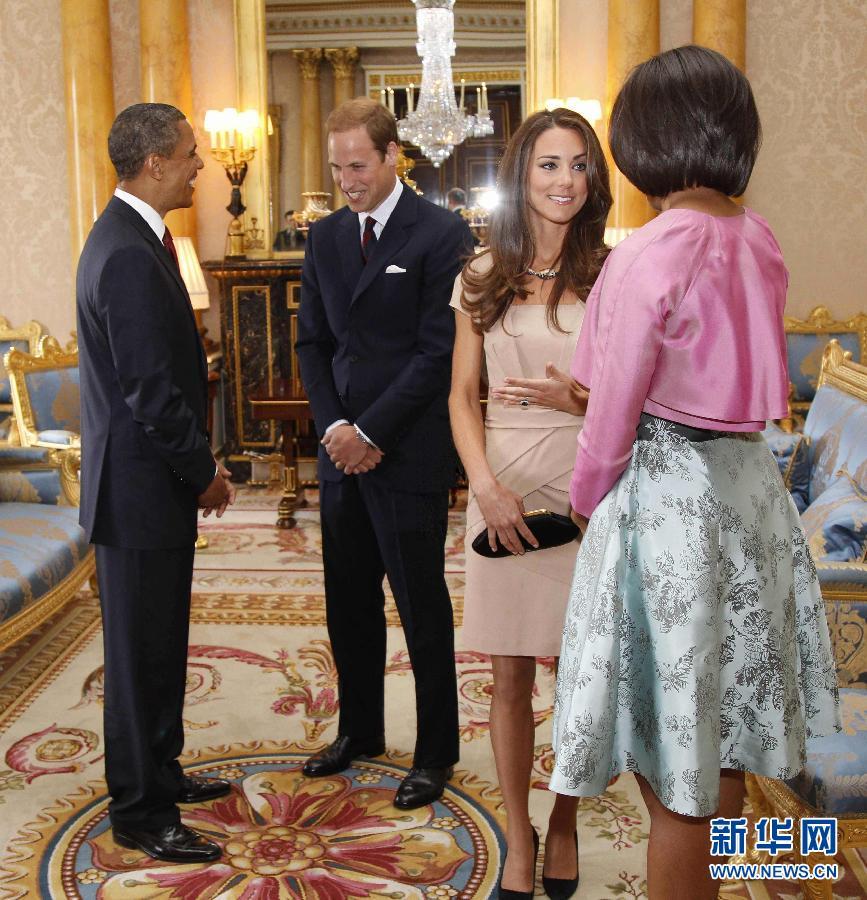 2011年5月24日,在英国伦敦白金汉宫,美国总统奥巴马(左一)及夫人米歇尔(右一)与刚刚结束蜜月的威廉王子(左二)及王妃凯特(右二)会面。 2011年4月29日,当凯特·米德尔顿在威斯敏斯特大教堂与英国威廉王子步入婚姻殿堂,又一个现代版“灰姑娘”的童话故事打动了无数人的心。婚后英伦王妃凯特的一举一动都成为媒体的焦点。在服装搭配上,凯特王妃很有自己的见解,她穿着打扮的风格也成为众多年轻姑娘效仿的对象,甚至被时尚界称为“凯特效应”。据报道她某次身着售价175英镑的某品牌平价驼色礼服裙在白金汉宫会见到访的奥巴马夫妇,照片一公布,这件礼服裙所属品牌的网站立刻被蜂拥而至的消费者挤爆,所有分店的该款裙子被抢购一空。整体色彩的统一与呼应,服装合身的剪裁,精心选择的巧妙配饰,打造出凯特王妃优雅、简洁、大气、端庄的穿衣风格。新华社/路透(程婷婷编辑)
