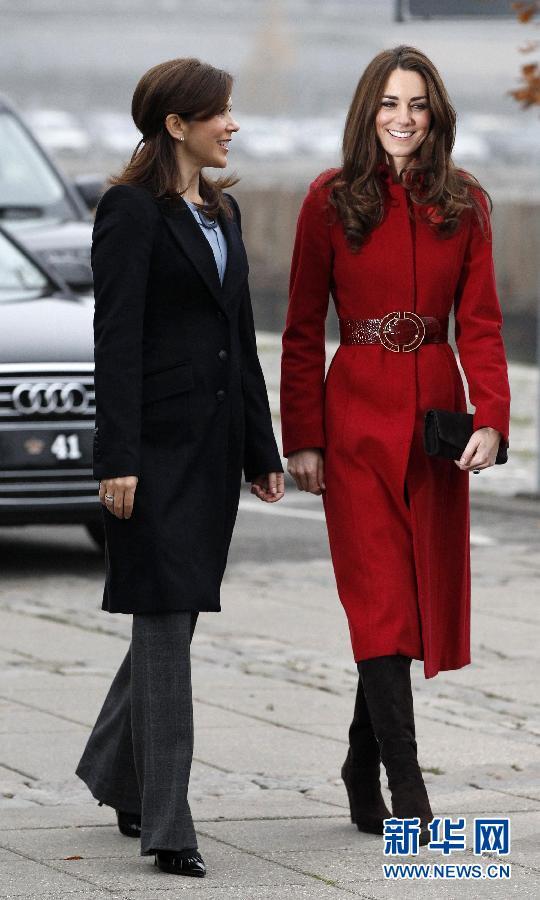 英国剑桥公爵夫人、威廉王子的妻子凯特王妃(右)在丹麦哥本哈根访问联合国儿童基金会时身着饰有宽腰带的款式简洁大红色大衣并搭配棕色长靴和棕色手包(2011年11月2日摄)。 新华社/路透(程婷婷编辑)