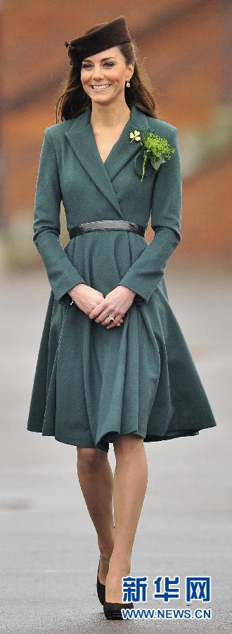 3月17日,英国剑桥公爵夫人、威廉王子的妻子凯特王妃在英国奥尔德肖特军事基地看望爱尔兰近卫军成员时身着收腰绿色连身裙搭配棕色帽子和棕色高跟鞋。新华社/路透(程婷婷编辑)