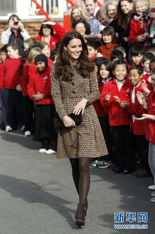 2月21日,英国剑桥公爵夫人、威廉王子的妻子凯特王妃在英国牛津参访一所学校时身着棕色裙式外套并搭配与之呼应的棕色靴子和棕色手包。新华社/路透(程婷婷编辑)