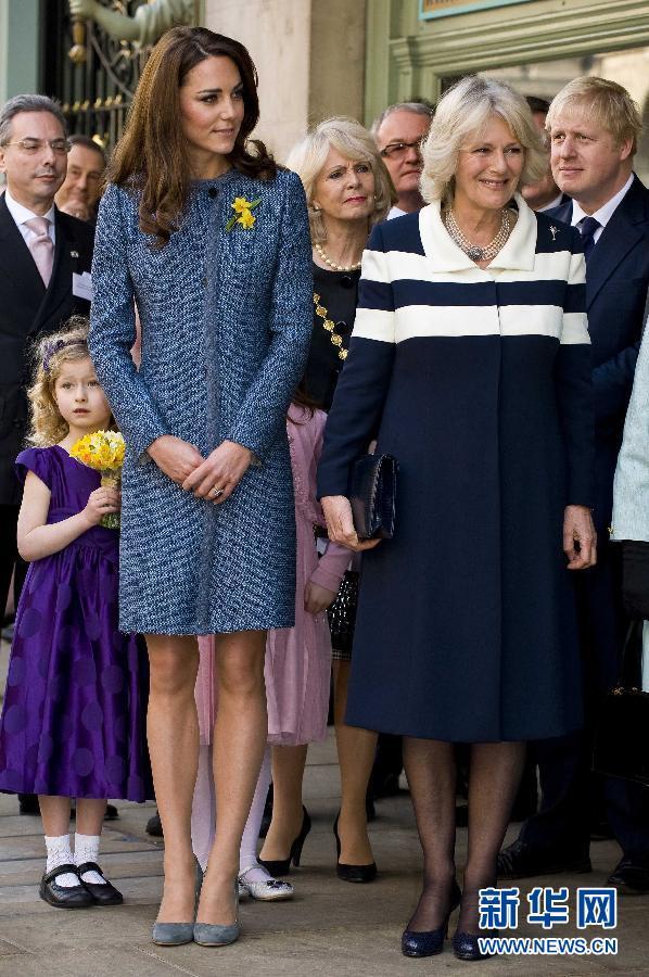 3月1日,英国剑桥公爵夫人、威廉王子的妻子凯特王妃(左)在英国伦敦参访一家食品仓库时身着灰蓝花色外套并搭配灰色高跟鞋。新华社/路透(程婷婷编辑)