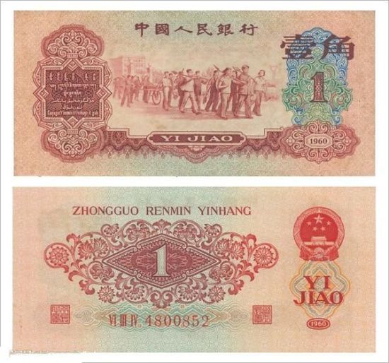 枣红一角:是第三套人民币的首发票券,也是该套一角币中唯一一张年号为“1960”的纸币。整张币的主色调为枣红色,正面图案为教育与生产相结合师生图,票幅比同面额其他票券大,号码形体和印刷位置也不同于其他票券。
