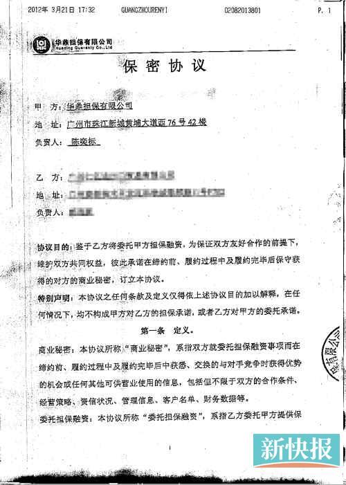 根据新快报记者昨日独家得到一份华鼎担保(甲方)与某贷款企业(乙方)签订的保密协议,落款日期在2011年4月20日。在该保密协议中的第2.3条款明确规定,华鼎为企业所做的融资计划、方案,委托融资担保条件,以及华鼎与企业签订的有关合同文件等,“非经甲方(华鼎)书面同意,不得提供或者泄露给任何第三方,包括拟向其融资的银行机构。”而如果贷款企业没有获得华鼎的同意,就将华鼎为企业所做的融资计划、方案及委托融资担保条件等信息提供或泄露给拟向其融资的银行机构,致使融资未成的,企业依然需要支付担保费,已支付的担保费也不退还;因此给华鼎造成的其他损失,华鼎也有权要求企业继续赔偿。