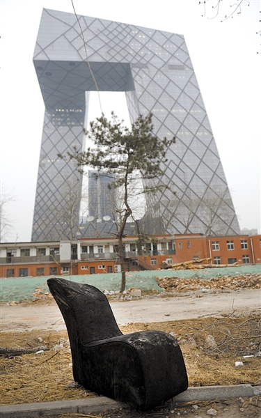 一把椅子被遗弃在清华大学光华路校区拆迁现场。近日,CBD一开发商起诉清华大学及未按时腾房的十余住户。
