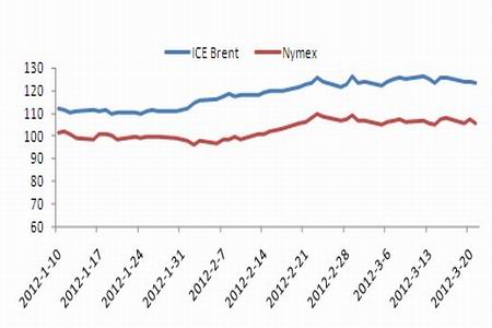 截止2012年3月22日的一周,纽约商品交易所轻质低硫原油首月期货净涨0.24美元,涨幅0.23%;每桶结算均价106.676美元,比前一周高0.478美元,结算价最高每桶108.09美元,最低每桶105.35美元。伦敦洲际交易所布伦特原油首月期货净跌0.41美元,跌幅0.33%;每桶结算均价124.596美元,比前一周低0.616美元,结算价最高每桶125.81美元,最低每桶123.14美元。