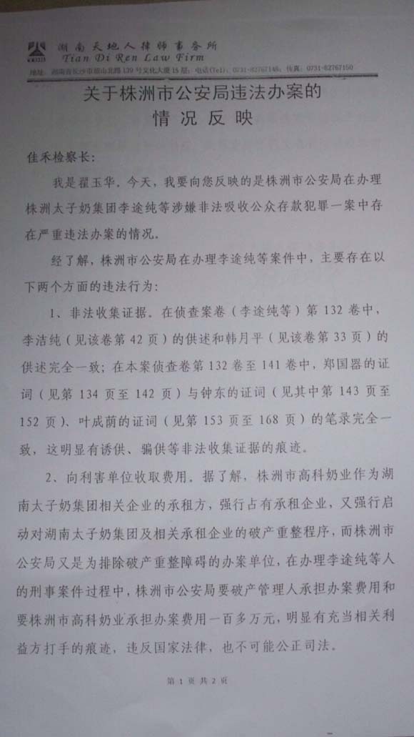 据李途纯代理律师翟玉华在向上级领导汇报的一份“关于株洲市公安局违法办案的情况反映”材料中明确提及株洲市公安局在办理李案过程中两个方面的违法行为:一是李洁纯的供诉与韩月平的供诉完全一致,郑国器的证词与钟东的证词、叶成萌的证词及笔录完全一致,“这明显有诱供、骗供等非法收集证据的痕迹。”;二是,株洲市公安局在办理李途纯案件中,要破产管理人和高科奶业承担办案经费一百多万元,明显有充当相关利益方打手的痕迹,违反国家法律,也不可能司法公正。