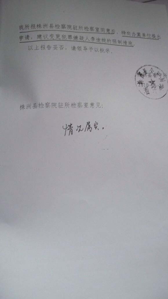 “鉴于李途纯病情严重,随时有生命危险,根据公安部第10号文件及《中华人民共和国看守所条例》第二十六条之规定,该犯不宜继续关押,为及时清除看守所的安全隐患,防止非正常死亡事故,依法保障在押人员的生命安全,我所报株洲县检查院驻所检察室同意后,特向办案单位提出申请,建议变更犯罪嫌疑人李途纯的强制措施。”株洲县看守所在2010年6月28日的报告中称。