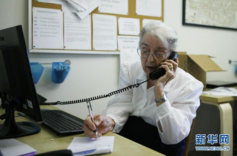4月4日,在美国首都华盛顿,92岁的志愿者路易丝·波特在位于国会山社区的“国会山村”办公室接听社区居民打来的电话。