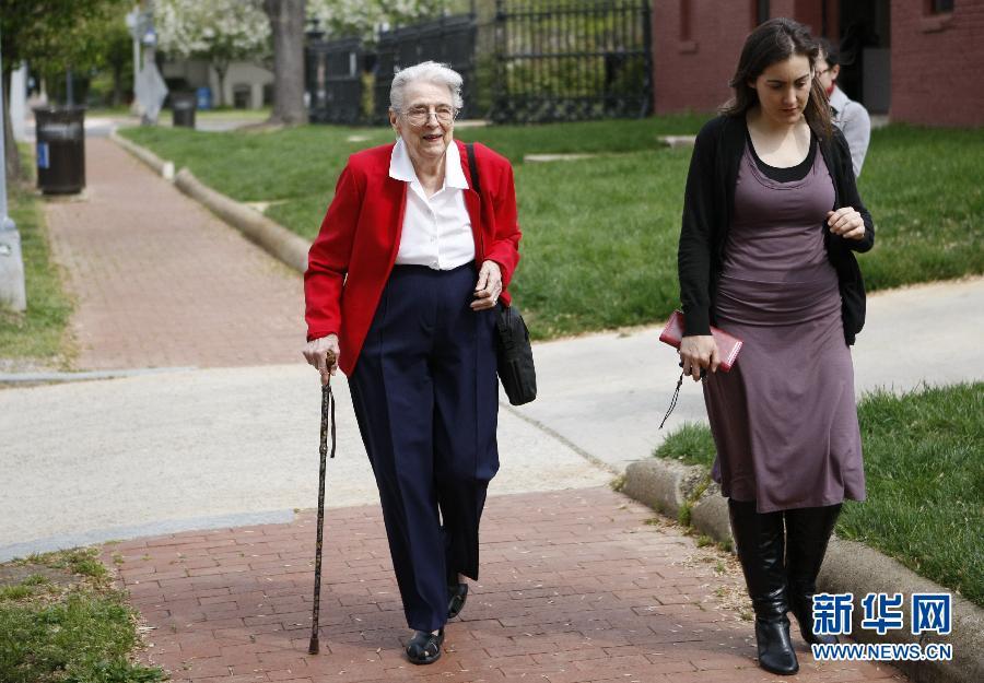 4月4日,在美国首都华盛顿,92岁的志愿者路易丝·波特(左)走出位于国会山社区的“国会山村”办公室,结束了每周一次4个小时的社区办公室工作。 新华社记者 方喆 摄
