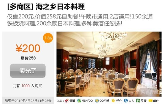 团购以其时尚、便捷、优惠的特点而广受消费者争相追捧,而如今单纯的低价风潮已不再盛行,精品餐饮团购逐渐成为资深“吃客们”关注的焦点。近日,大连海之乡日本料理铁板烧携手大众点评推出7.8折超值自助晚餐,限量供应的1000份团购券已经推出便被抢购一空,并且受到大众点评团购发烧友们的一致好评。