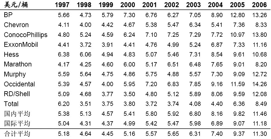 生产成本下图是1997—2006年美国能源公司以及国际能源企业的生产成本。从全球的平均数据来看,2006年的生产成本大致在11.3美元/桶,从趋势上看,1997年以来,生产成本出现了显著上升。