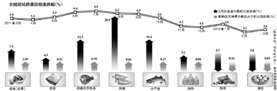 由于此前2月份的CPI迅速回落至3.2%,创下了20个月以来的新低。有分析人士认为物价已经进入下行通道。然而,3月底,特别是最近一段时间以来,随着蔬菜价格的明显上涨,食品价格依然是推动CPI高企的重要因素。3月份CPI同比上涨3.6%,其中食品价格上涨7.5%,鲜菜价格的涨幅更是达到了20.5%。食品在中国CPI中的权重约为30%。昨日发布的数据显示,食品价格上涨7.5%,并影响CPI总水平同比上涨约2.39个百分点。具体来看,粮食价格上涨4.3%;肉禽及其制品价格上涨11.3%(猪肉价格上涨11.3%);鲜菜价格上涨20.5%;水产品价格上涨11.4%;油脂价格上涨5.2%。仅仅是鲜果和蛋价有所下降。其中,鲜菜价格影响CPI就达到0.64个百分点。