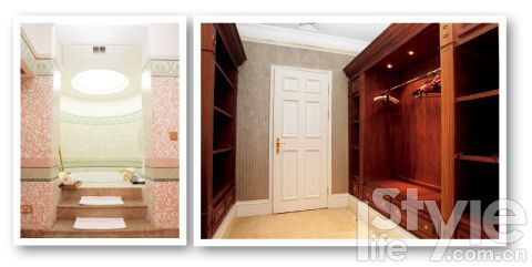 两间卧室带的卫浴间特别惊艳,都配有淋浴间和浴缸。马赛克的墙面、白色镶金边的台盆和镜子罗马风格的设计,让住客在泡浴时仿佛穿越到了罗马。两间卫浴间,除了一只抽水马桶外,还有一只清洗之用的坐洗器;淋浴间中备有一张小木椅;浴缸边上备有纯净水、香熏、浴盐……这些细节都流露出酒店细致入微的服务理念。两间卧房各带有一个衣橱间,四面墙除了窗台一面和门之外,其余两面墙的面积皆是衣橱。