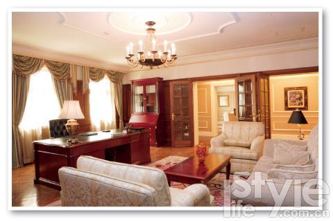 源自皇室的小休息室餐厅后是一间小休息室,供会议期间或餐后三两客人品酒、雪茄单独休息会谈之用,会议室里侧的室内阳台,也摆放着两张沙发,同样供客人商谈休息之用。这样的空间设置,通常在欧式建筑中能够见到,如英国宫廷中,就设有此类小会议室,供大臣们歇息会谈。