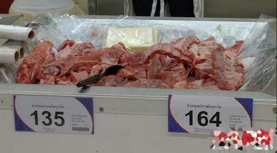 瘦肉和排骨一个价格135铢一公斤, 100人民币可以买3.5公斤。 瘦肉和排骨一个价格135铢一公斤, 100人民币可以买3.5公斤。