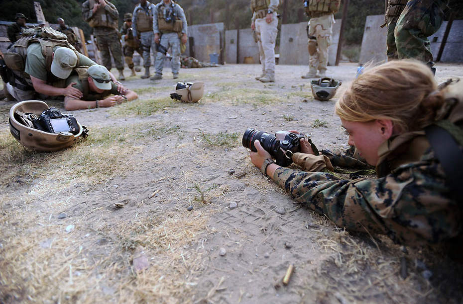 当地时间2011年8月12日,指挥部的Erica在训练中拍摄士兵们演示如何搜寻逃犯。图片来源:环球网