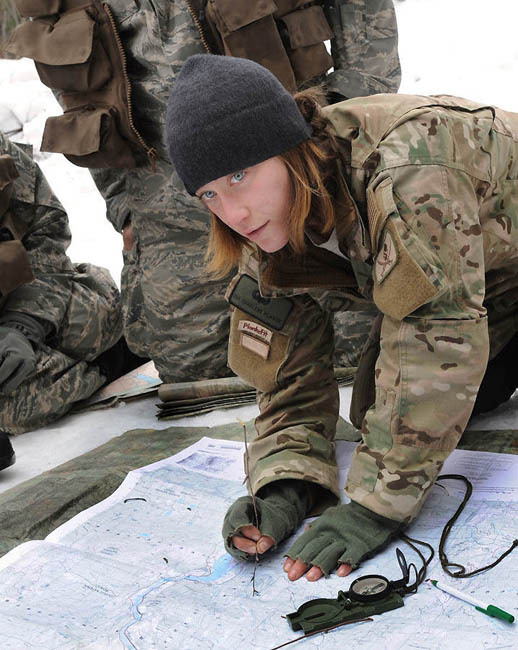 空军下士Charlene Plante教她的学生使用三角测量法。这部分的教学目的是教会学生如何运用地图、指南针和树枝精确找到自己的位置。图片来源:环球网