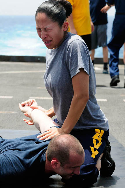 当地时间2012年3月2日,海军二级士官Jenna Rainbolt被临时分配到尼米兹核动力航空母舰(CVN 70)安全部。她按规定被喷上辣椒油树脂。图片来源:环球网
