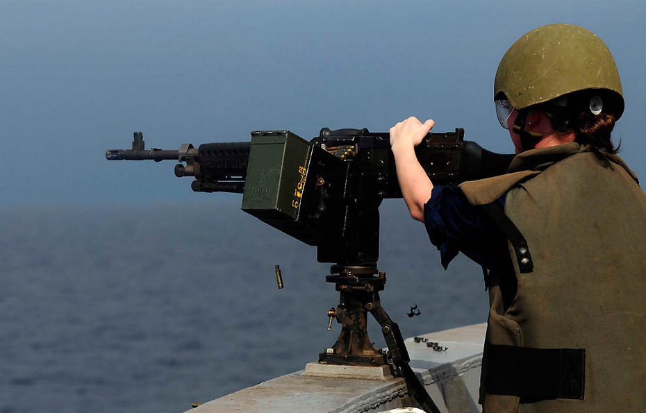 当地时间2011年7月11日,海军枪手Megan Halliburton从两栖攻击舰上向军事海运司令部军火船射出一条抛绳。图片来源:环球网