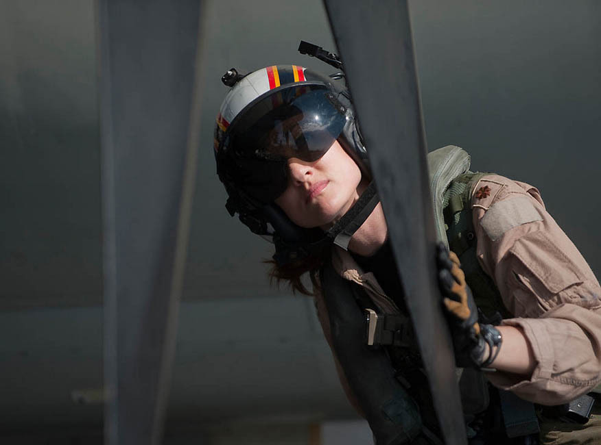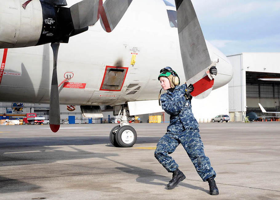 当地时间2012年1月25日,飞机指挥官Tara Refo被分配到空中第125预警队(VAW),负责检查飞行器的螺旋桨。图片来源:环球网