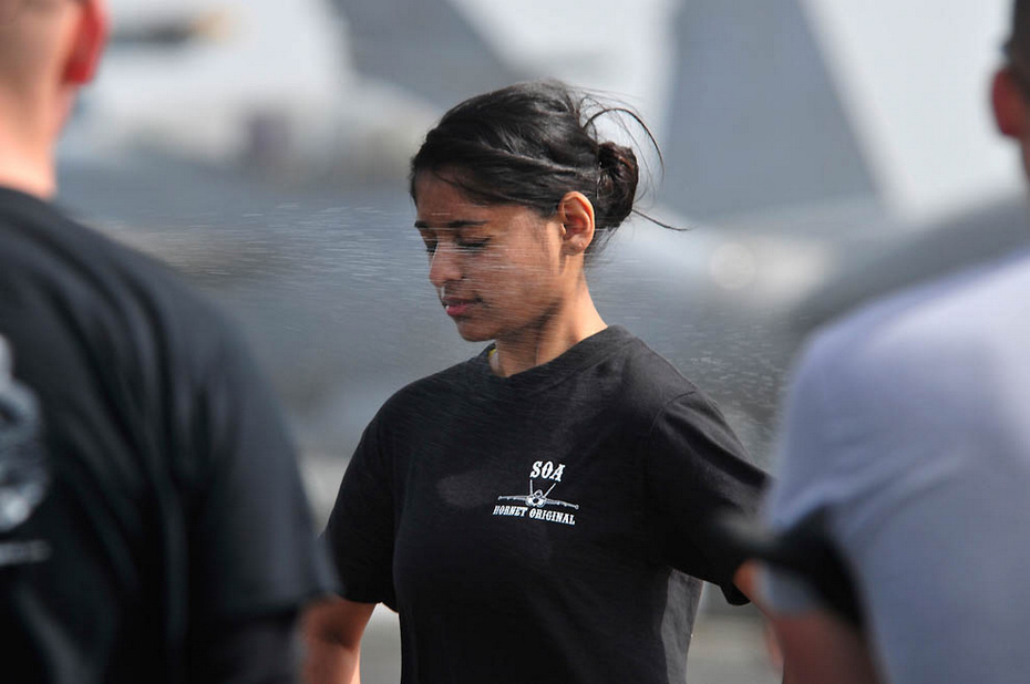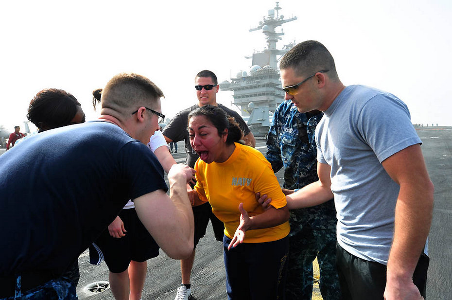 当地时间2012年3月2日,在尼米兹核动力航空母舰的飞行甲板上,卫兵二级士官Jonathan Prichard 指导海军三级士官Gladys Jerezrendon如何在喷射辣椒油树脂后睁开眼睛。图片来源:环球网