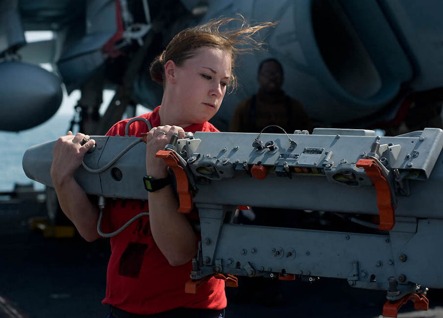 当地时间2012年1月12日,航空三级机械师Alecia Crockett被分配到空军第137中队(VFA) 。在“尼米兹”级核动力航空母舰的飞行甲板上,她在搬运一个BRU-41喷射器。图片来源:环球网