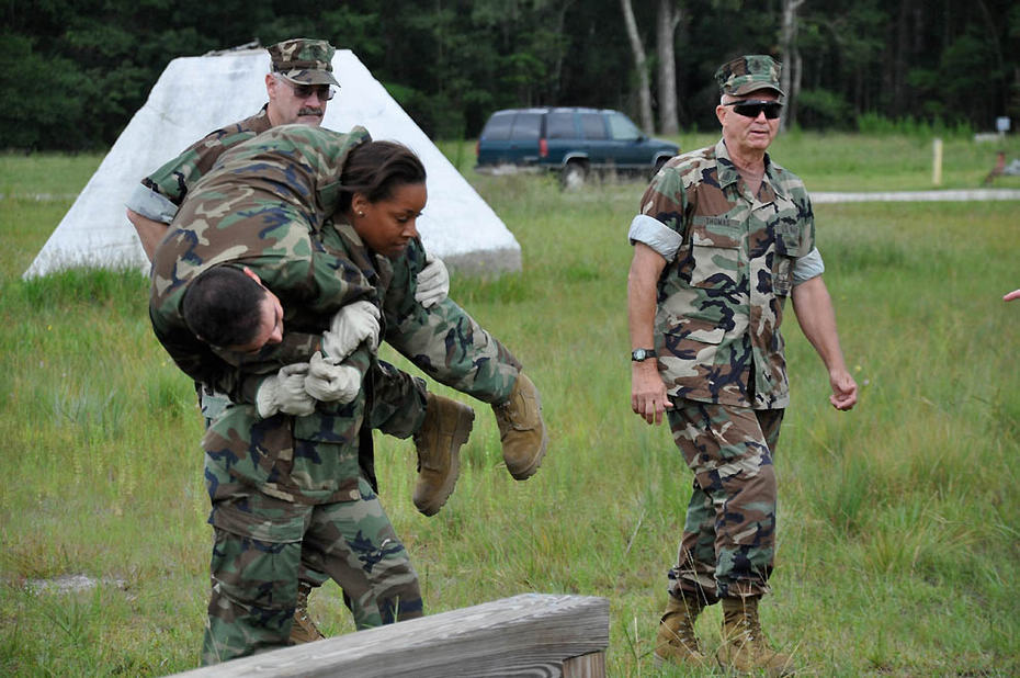 当地时间2011年7月8日,海军移动建设指挥部的电工Whitney Shields扛着一名同伴。这是第六届海军修建营成员竞技的一部分。图片来源:环球网