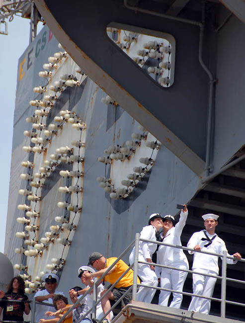 当地时间2011年7月15日,经过6个月的航行后,航母回港。水兵们在甲板上等候上岸。图片来源:环球网