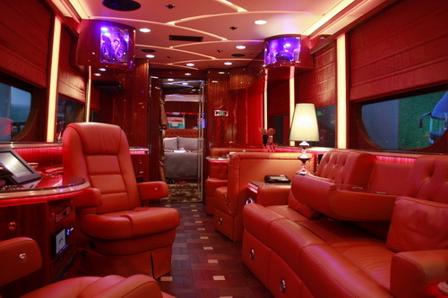 从前门进入车辆的内部,你会真正感受到这辆房车的内里乾坤,并不高调的外观之下有着超乎寻常的奢华。沿着不锈钢与高级瓷砖装饰而成的踏步拾级而上,最先看到的是驾驶区,进口的格拉默司机座椅采用空气悬浮式结构,带有电加热功能,提供绝佳的舒适。驾驶区之后是会客与休闲区,以色列卫星电视系统、先锋车载音响都被安排这个区域,让乘客在旅行途中也可以享受高品质的视听。安置在会客区的三人真皮沙发坐极佳,单人沙发则具有电动后仰、电动腿托、腰部按摩功能。车顶和地板分别采用艺术造型的皮革装饰和进口羊毛地毯,在车内氛围灯的烘托之下极尽奢华感。同样质感的还有每一个车窗,窗套采用真皮包裹,窗帘则是完全电控。房车“主卧室”的大床具有电动按摩功能,正对的顶部则安装带有纱窗与遮光帘的天窗。停车后,房车还可以展开两侧的大型遮阳蓬,开启车外影视娱乐系统,在郊外享受丰盛烧烤的同时,又不会错过精彩的视听娱乐。