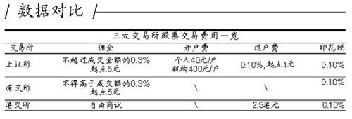 相较于2008年上证所10万元交易成本0.72%,欧美证券交易所收费普遍较低。上证所报告显示,如果将佣金、税费和价格冲击成本计算在内,2007年第一季度纽交所交易成本最低为0.15%;美国纳斯达克(微博)交易所交易成本稍高,达到0.2%基点;德国证券交易所和法国证券交易所交易成本分别是0.2%和0.23%。放眼全球主要股市,佣金最高的依次为澳大利亚、中国香港和葡萄牙;以总成本来说,前三名依次为英国(0.45%)、中国香港(0.36%)和葡萄牙(0.28%)。
