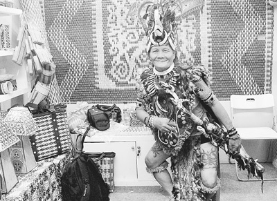 雅加达手工艺品交易会每年都会选定一个地区的手工艺品为主题,本届交易会的主题是加里曼丹岛的传统手工艺品,来自该地区的参展商占据着展览大厅最显眼的位置。在一个手工装饰品的摊位前,记者看到一位老人戴着羽毛镶嵌的鸟形头饰,穿着原始的民族服装,腰间佩带着镶满各种装饰品的刀。81岁的老人名叫培都士,他是来自加里曼丹岛上的达雅族。老人身上的服饰是几百年前达雅族的传统服饰,他身上佩带的刀则是加里曼丹岛的特色传统刀具。