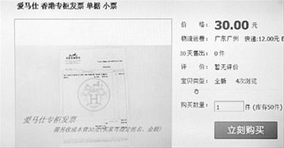 昨天,记者在百度(微博)上搜索发现,不少网店均能提供 “Hermes爱马仕”等专柜的专用购物小票,并可根据要求指定打印内容。在一家网店的“宝贝说明”中,卖家写道:发票采用上等牛皮纸制作,客人可指定打印内容。如需打印,请先提供购买者姓名(可不打印)、包包的款号和需要打印的金额、日期等信息。记者查询发现,代打印“爱马仕/Hermes”购买证明(可打印购买者姓名、款号、金额)则是10元/套,如是更为逼真的”爱马仕/Hermes“购物礼品袋+代打印”爱马仕/Hermes“专用发票购买证明的价格则是15元/套。
