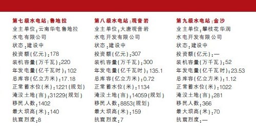 金沙江中游计划开发上虎跳峡、两家人、梨园、阿海、金安桥、龙开口、鲁地拉、观音岩等“一库八级”电站,总装机规模超过三峡。