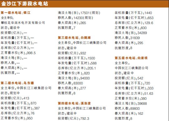 最新统计显示,金沙江中下游从梨园至向家坝的10级电站的装机总规模达6235万千瓦,比2003年的规划装机总和多出1057万千瓦,接近半个三峡的装机容量(2250万千瓦)。